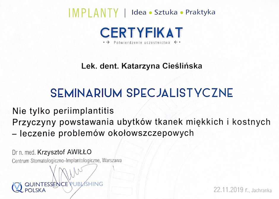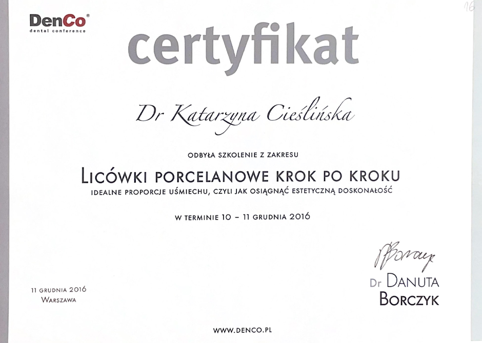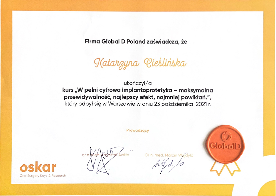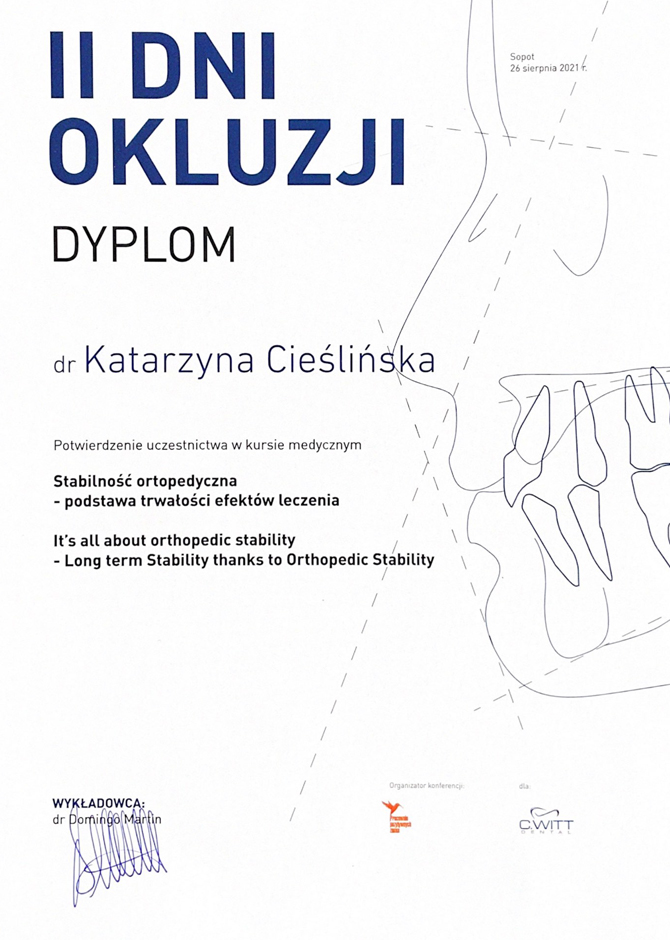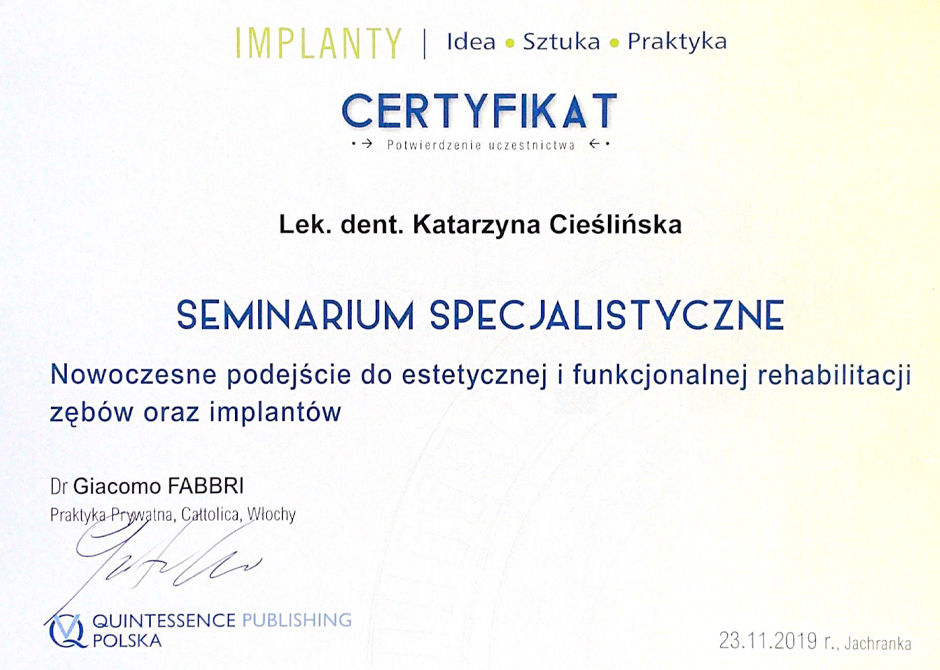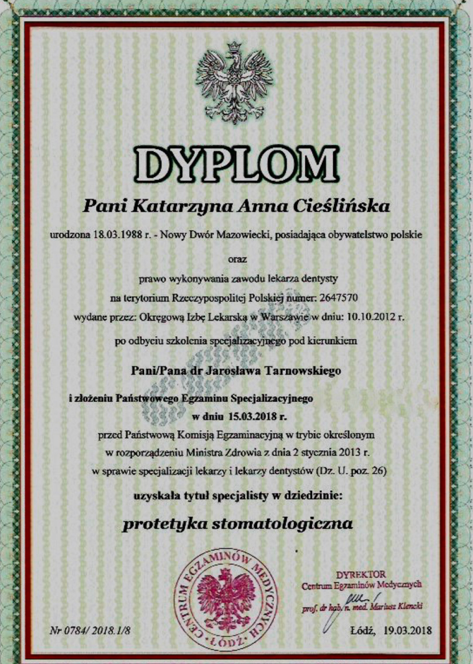 Odkąd skończyłam studia, nieustannie rozwijam się i podnoszę swoje kwalifikacje uczestnicząc w szkoleniach zawodowych. Jednak moim marzeniem było dostanie się na specjalizację z protetyki stomatologicznej. W Polsce jedynie ok. 20 % praktykujących stomatologów posiada tytuł specjalisty. Specjalizacja trwała 4 lata i polegała na leczeniu protetycznym pacjentów w przychodni, odbyciu licznych kursów specjalizacyjnych w całej Polsce, napisaniu 2 prac naukowych oraz zdaniu egzaminu pisemnego i ustnego. W 2018 r. otrzymałam tytuł specjalisty z zakresu protetyki stomatologicznej.