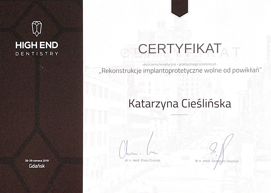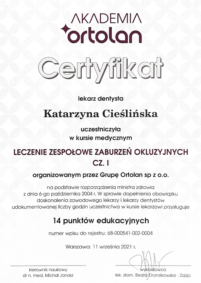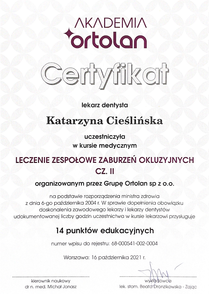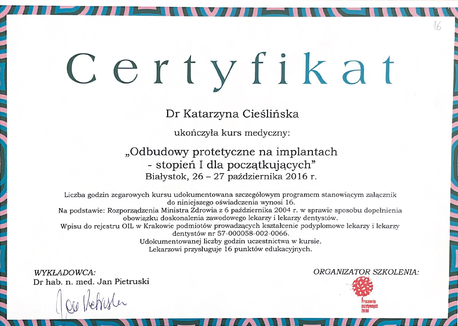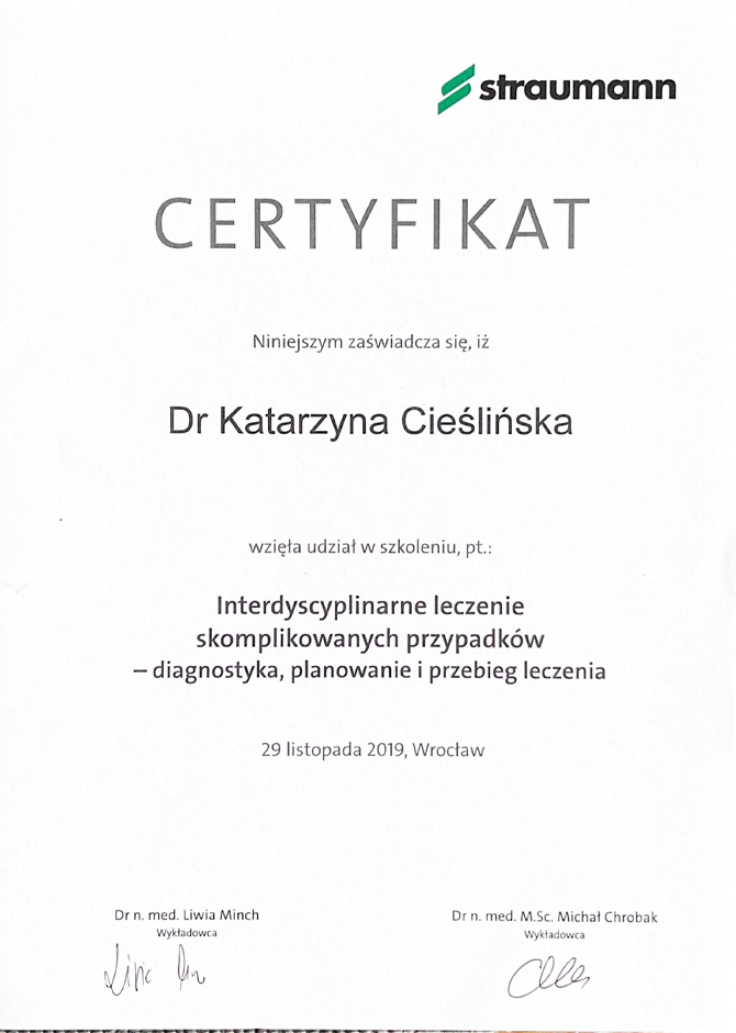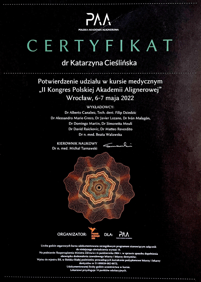 Odkąd skończyłam studia, nieustannie rozwijam się i podnoszę swoje kwalifikacje uczestnicząc w szkoleniach zawodowych. Jednak moim marzeniem było dostanie się na specjalizację z protetyki stomatologicznej. W Polsce jedynie ok. 20 % praktykujących stomatologów posiada tytuł specjalisty. Specjalizacja trwała 4 lata i polegała na leczeniu protetycznym pacjentów w przychodni, odbyciu licznych kursów specjalizacyjnych w całej Polsce, napisaniu 2 prac naukowych oraz zdaniu egzaminu pisemnego i ustnego. W 2018 r. otrzymałam tytuł specjalisty z zakresu protetyki stomatologicznej.
